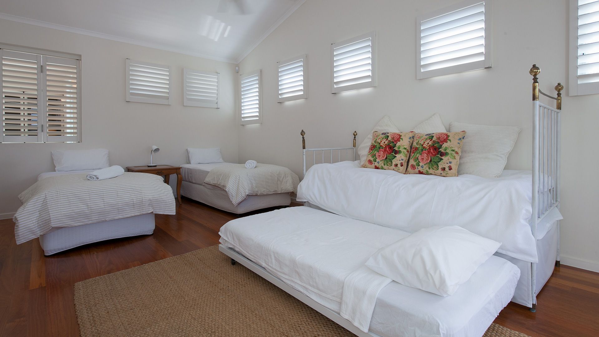 Bedroom 5 - 2 long Single beds (default) that can be zipped together to make a King bed, as well as a King Single bed and Trundle (Note, the trundle is not suitable for adults). If you require the single beds to be made into a king,