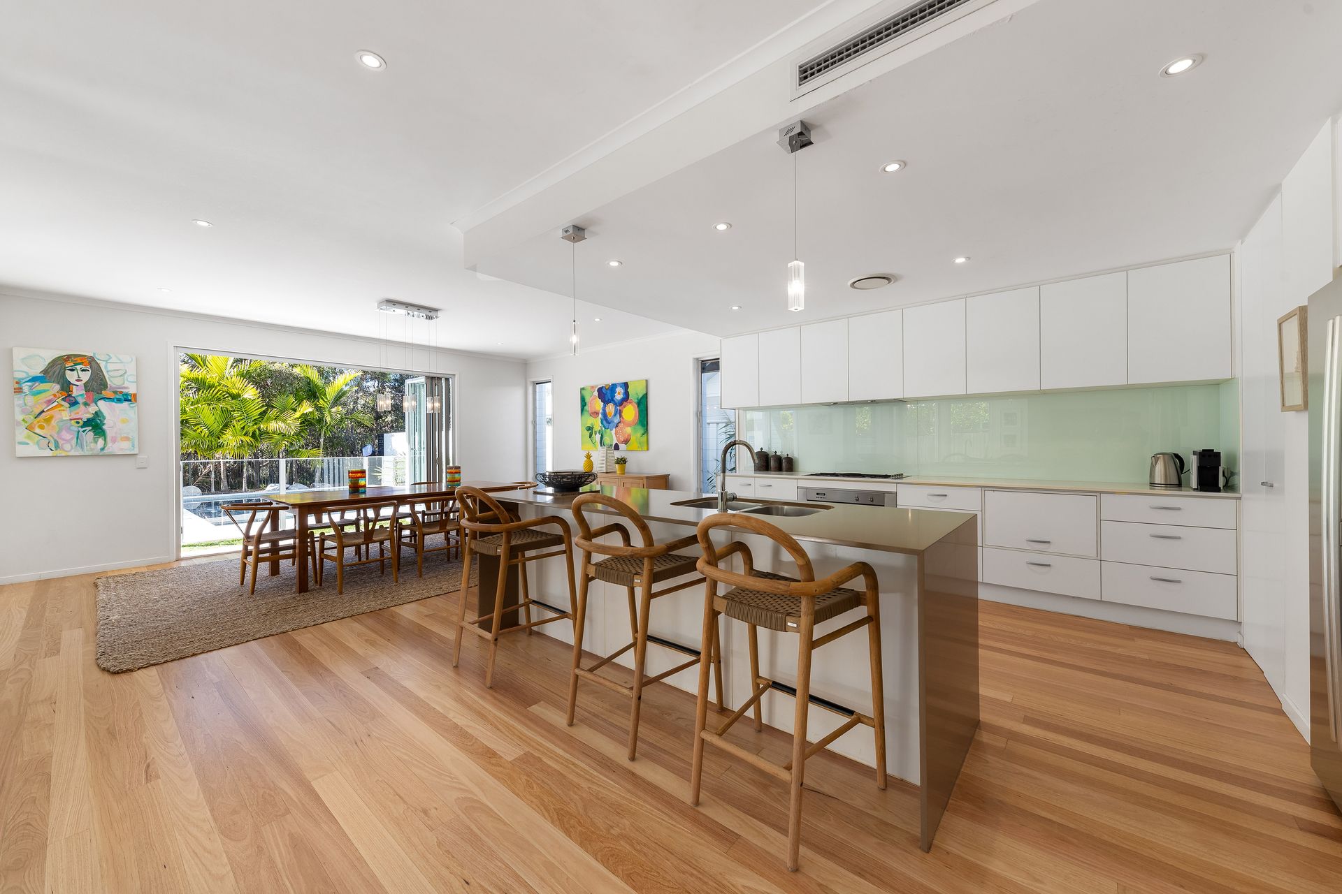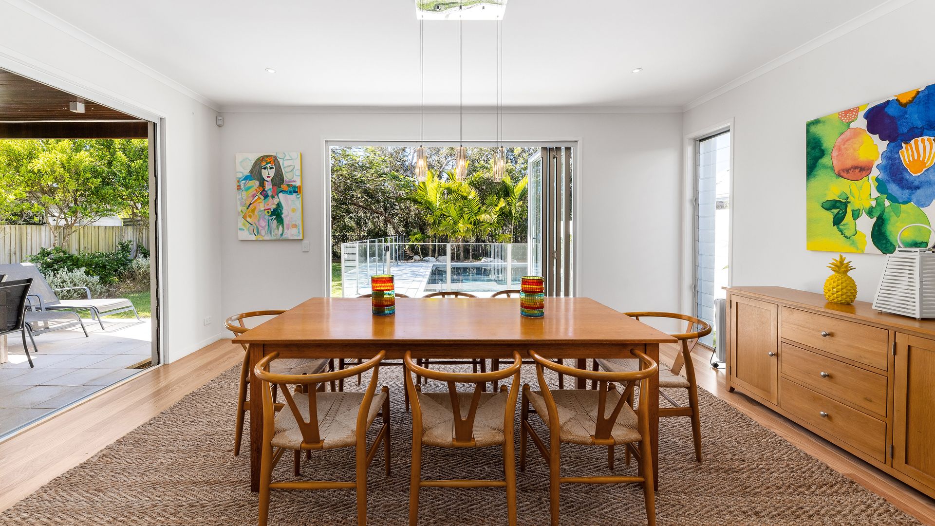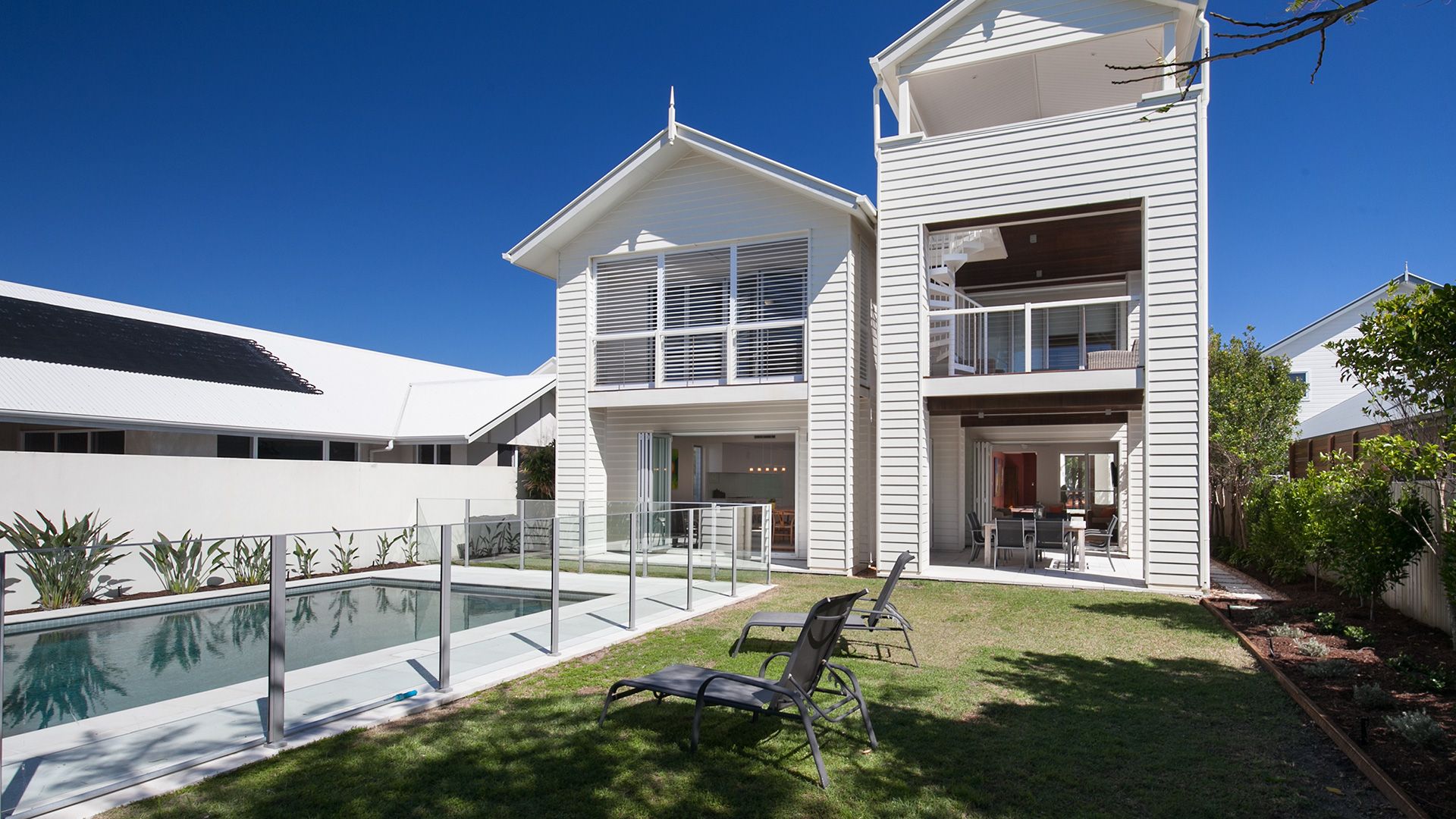 Generous open plan living spaces on the ground floor that flow onto the lovely outdoor entertaining area and pool make this the ideal, family friendly holiday home. Glass bi-fold doors, louvers and doors to the north take full advantage of the cross ventilation, keeping the house nice and cool.