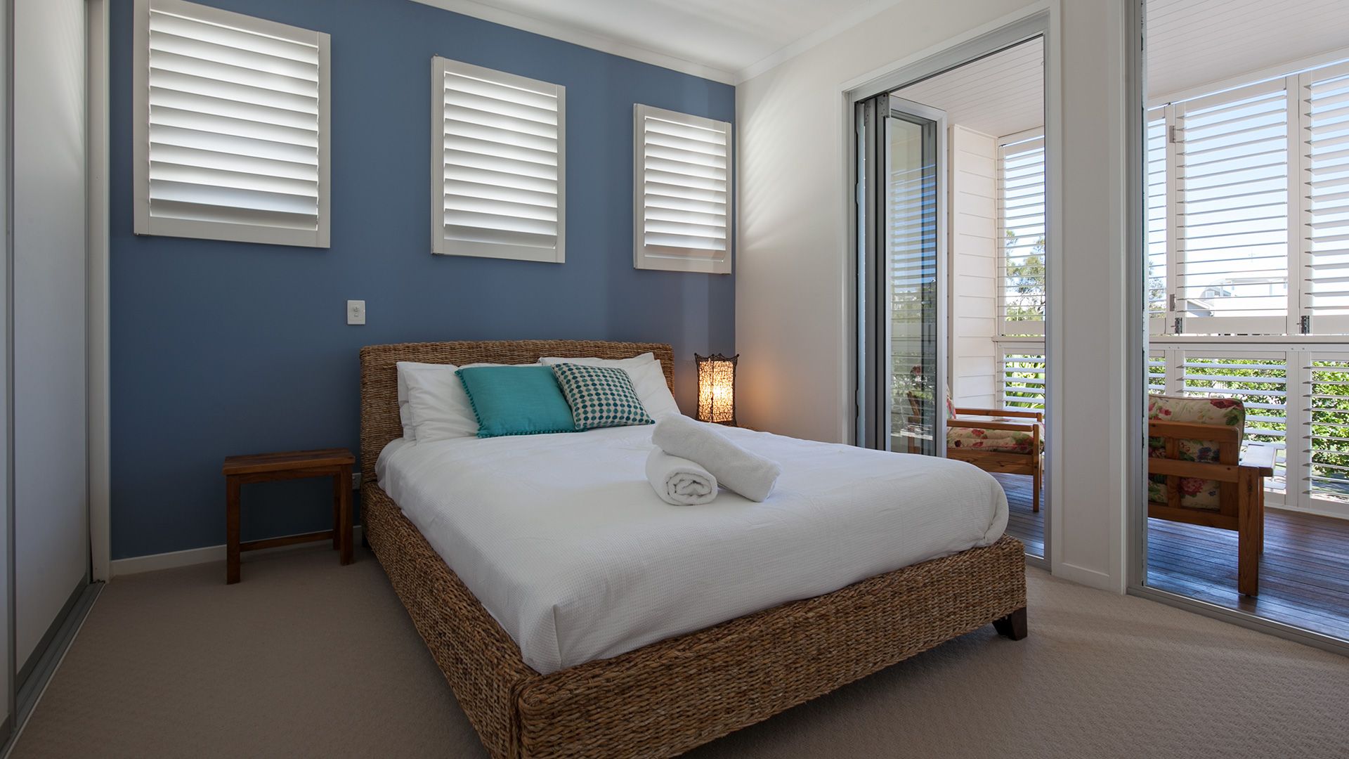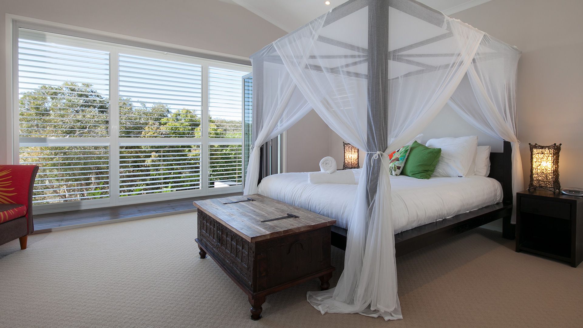 Master Bedroom 1 - Queen bed and large ensuite with spa bath shower and toilet, and a private deck overlooking the dune reserve