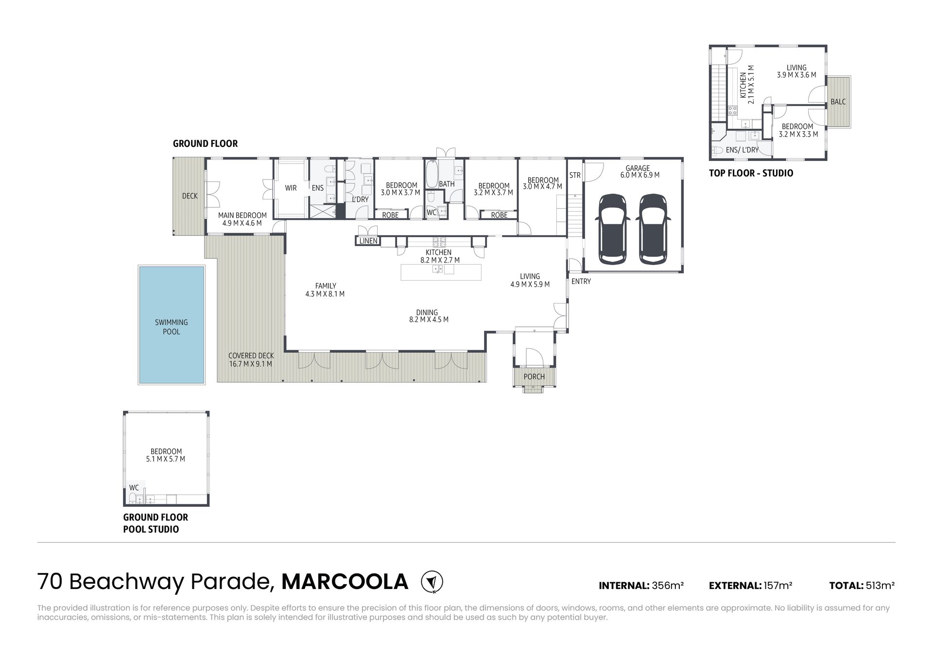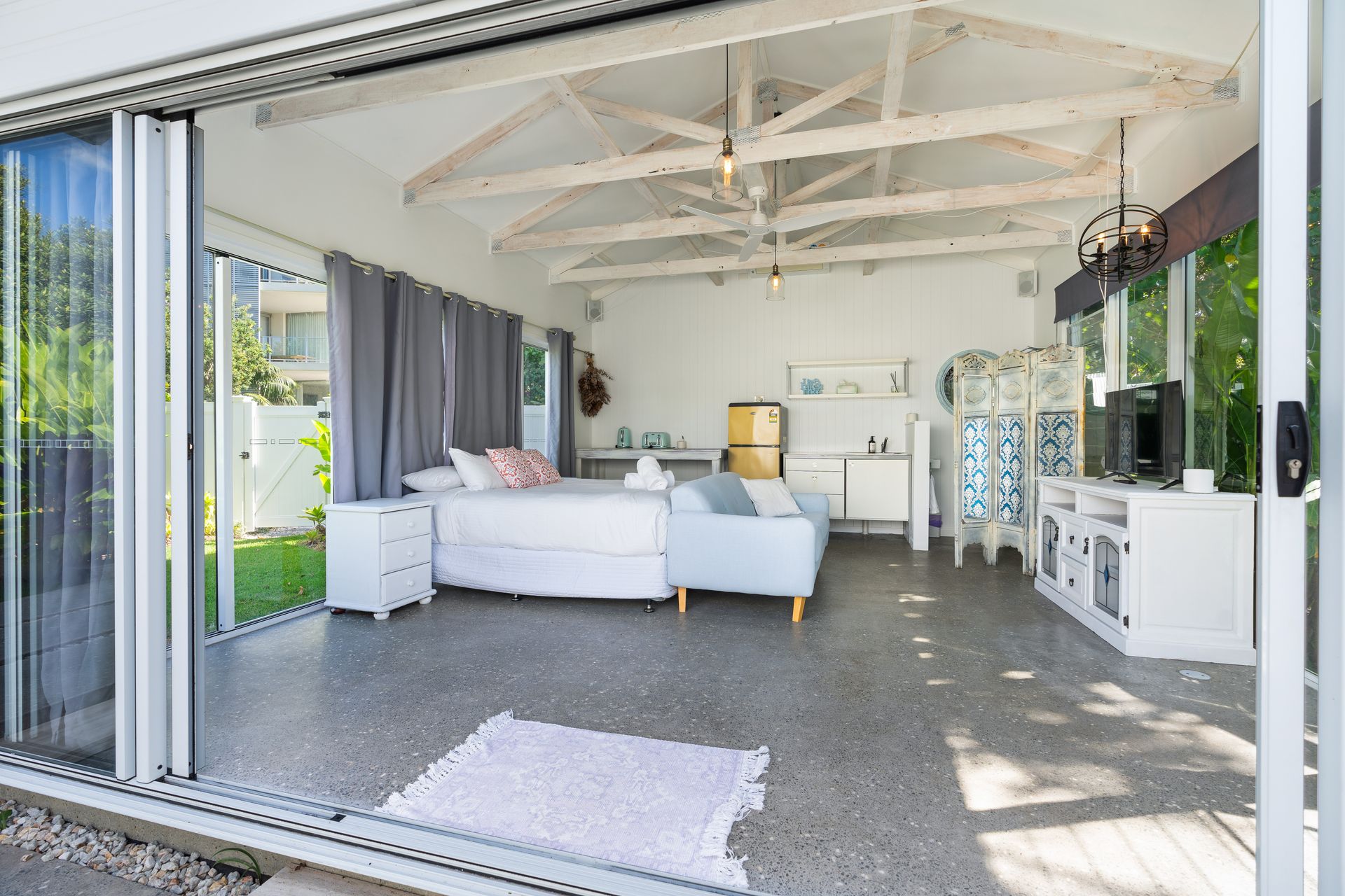 The poolside studio, accessible via the courtyard, includes a queen bed, TV, fridge, and toilet, offering additional space for guests seeking privacy. The north-facing outdoor area features a covered deck, a pool, and casual lounges, perfect for unwinding or entertaining.