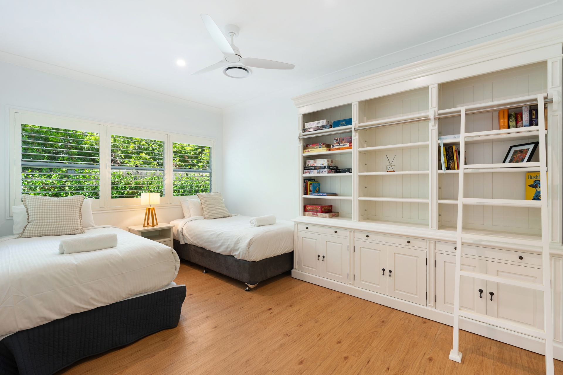 Bedroom 4: Two single beds, air conditioning, built-in robe, ceiling fan.