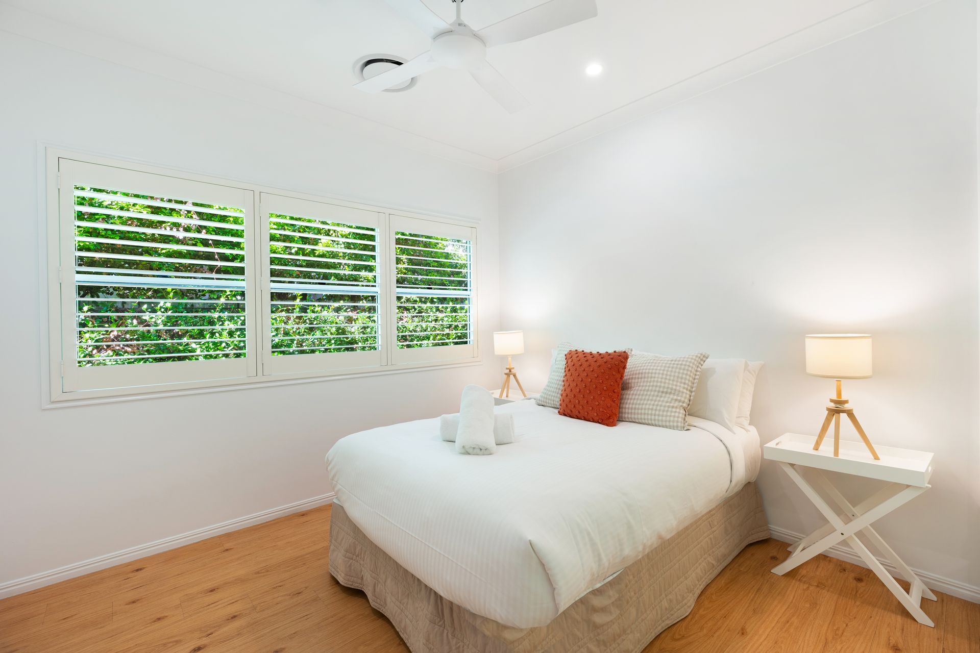 Bedroom 2: Two single beds, air conditioning, built-in robe, ceiling fan.