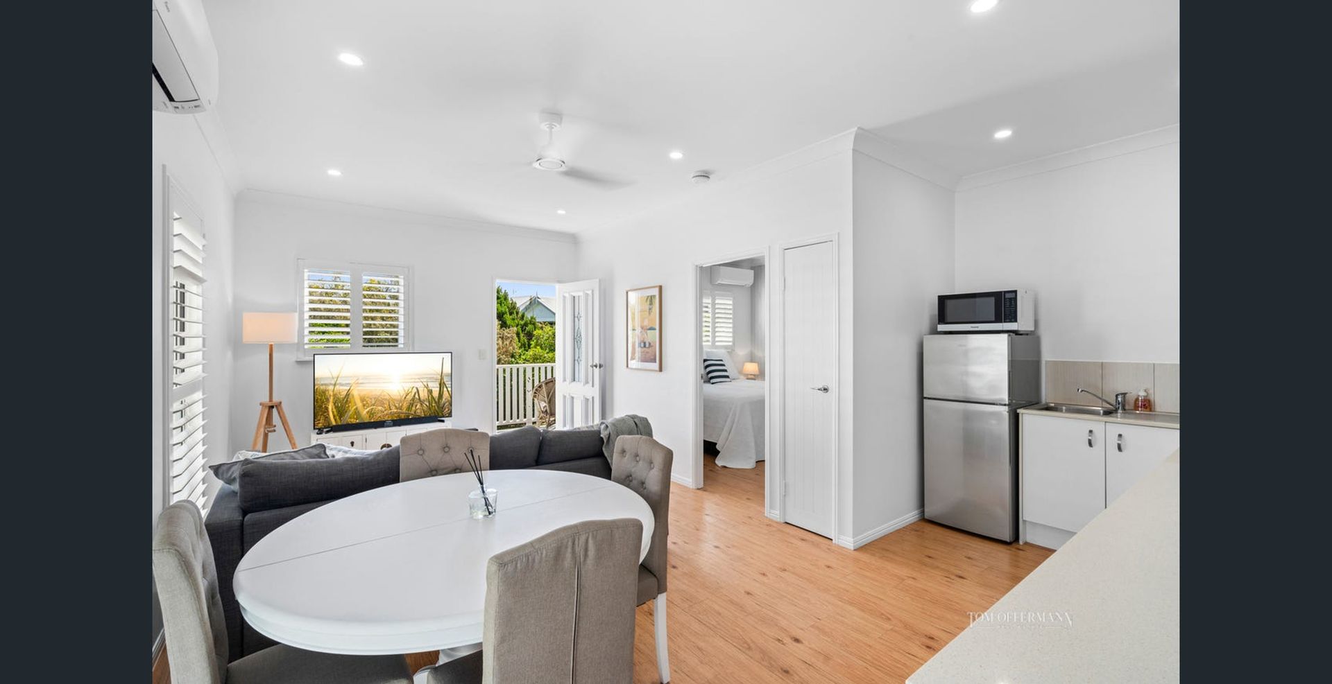 Master Bedroom (Bedroom 1): King bed, en-suite with shower and toilet, walk-in robe, air conditioning, balcony access, ceiling fan.