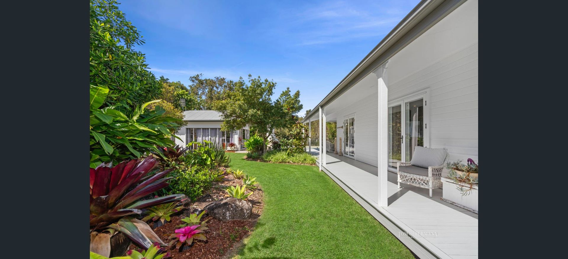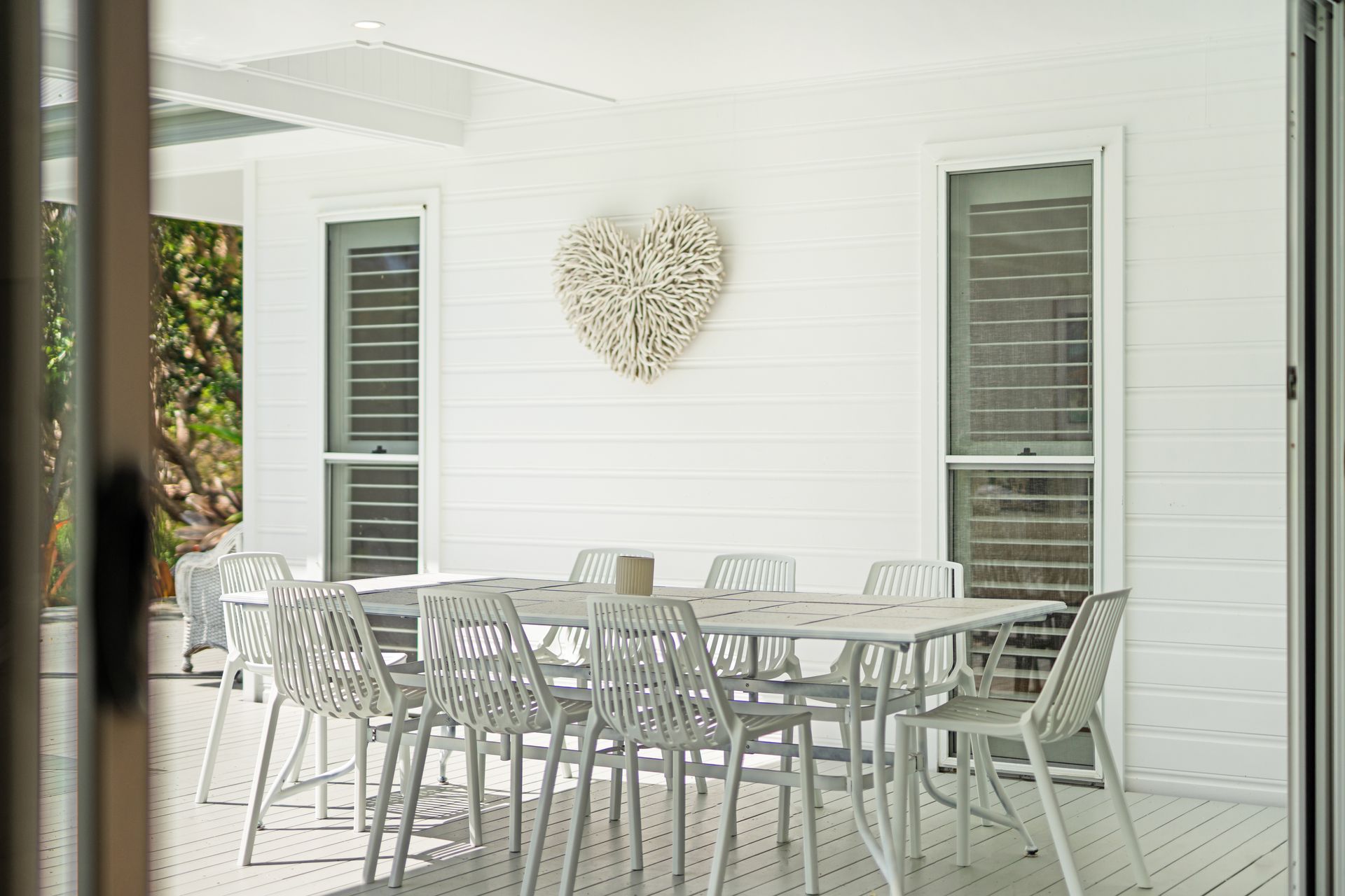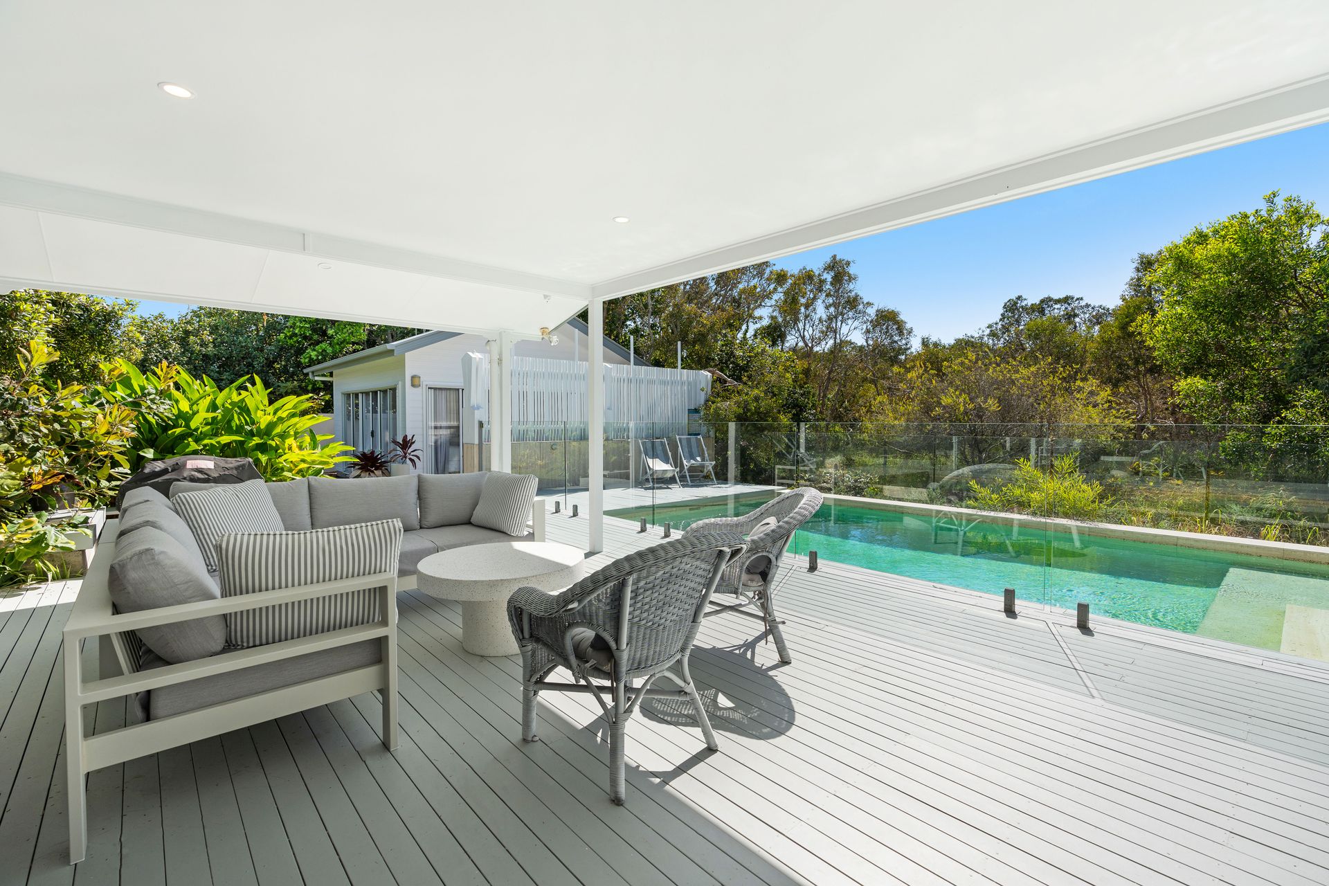The home features two lounge areas, high ceilings, and floor-to-ceiling glass doors that open to a covered deck overlooking the pool. These spaces combine comfort and style, offering an ideal setting for family gatherings or quiet evenings. The property is pet-friendly (on application), though the partially fenced yard is more suitable for small, quiet indoor dogs. Guests can enjoy the peaceful surroundings as there is ample space for everyone to unwind and enjoy outdoor entertaining beside the BBQ. There is also a lovely side verandah to curl up with a good book for the afternoon or to watch the kids play safely on the grass.